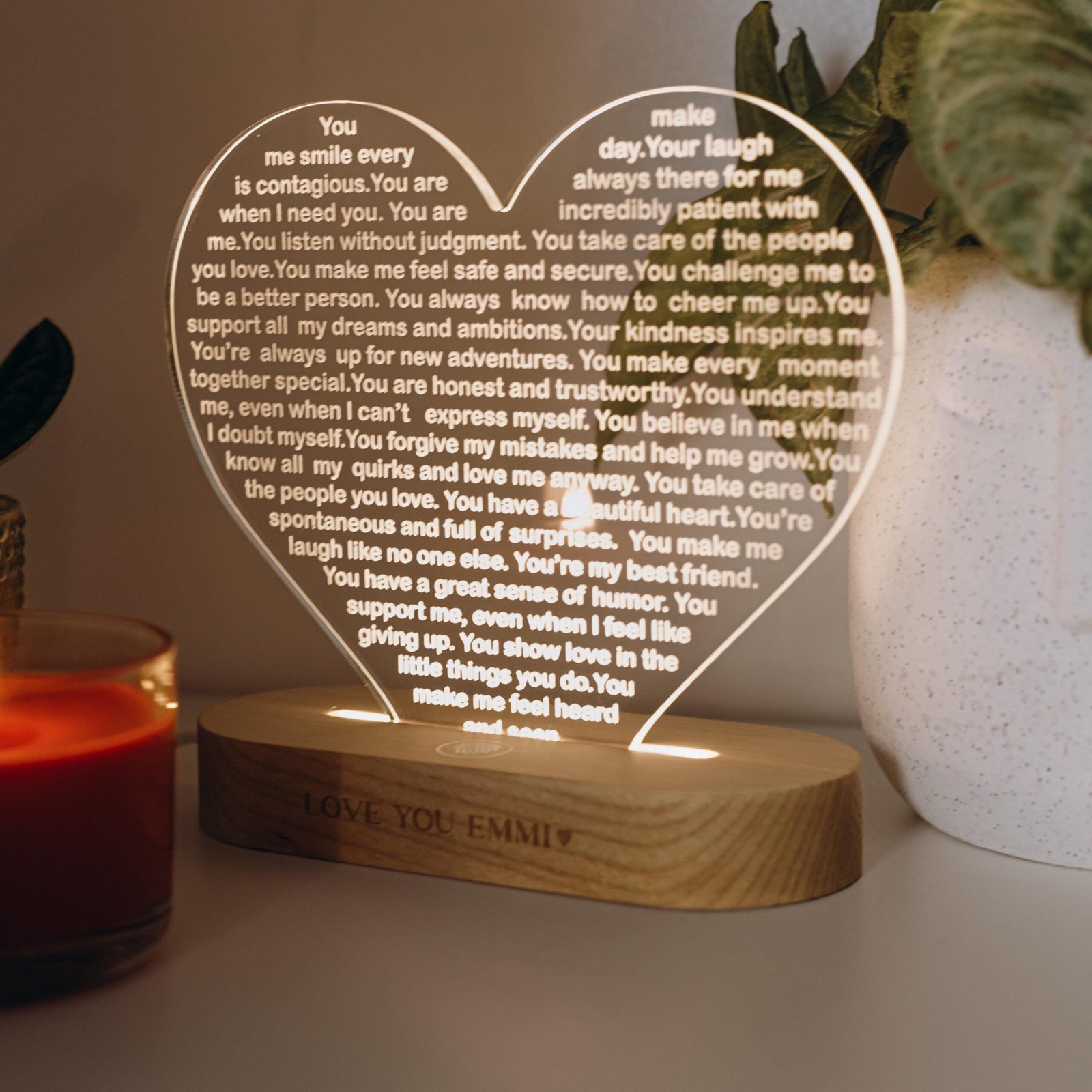 Light up her world with a custom heart night light—a perfect Christmas gift, a thoughtful 30th birthday surprise, a romantic gesture, or a touching anniversary present. Let love shine bright in the form of this personalized night light that symbolizes your deepest affections and conveys your heartfelt emotions in a warm and luminous way. Illuminate her heart and space with a gift that radiates love and togetherness.